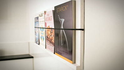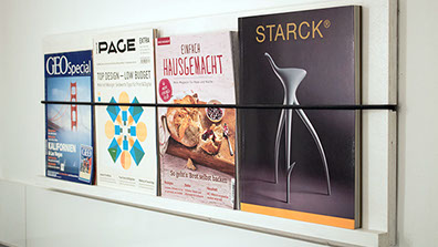 Dieser Zeitschriftenhalter soll auch in kleinen Räumen eine platzsparende Grundversorgung an mehr oder weniger wichtigem Pressematerial gewährleisten. Nicht ganz uneigennützig musste diese Idee auf jeden Fall aus dem Kopf an die Wand.